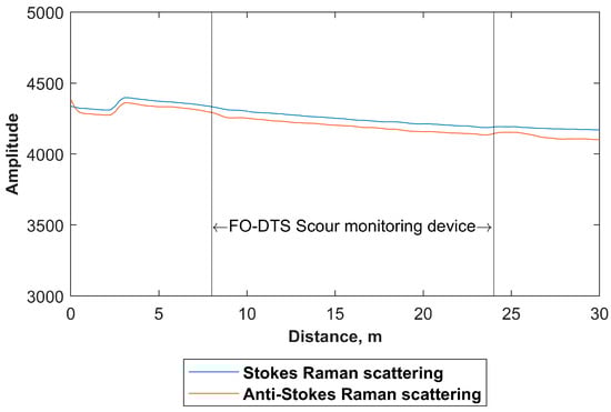 The raw Stokes and anti-Stokes Raman scattering signals observed along the FO cable were examined to assess whether excessive and non-uniform losses developed in the FO cable from twining it around the PVC pipe. An example of the raw Stokes and anti-Stokes Raman scattering signals is shown in Figure 4, which illustrates that twining the FO cable around the PVC pipe did not result in any additional or sudden losses along the FO cable besides the consistent signal attenuation typically observed in the DTS applications. Therefore, this supports that the size of the used PVC pipe (diameter 0.06 m) was sufficient to build a reliable FO-DTS scour-monitoring device using BRUsens® FO cable. Furthermore, the properties of the signals observed along the FO-DTS scour-monitoring device, coupled with the spatial coverage capabilities common in DTS units, indicate the potential to increase the length of the FO-DTS scour-monitoring device in field applications if necessary and that multiple devices can also be attached in a series to measure scour at various locations (e.g., multiple piers and abutments of a bridge).