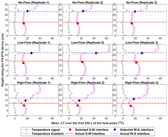 The thermal and convection properties of the sediment, water, and air media control the temperature increase observed in them due to the applied heat pulse. Hence, it is expected to observe the maximum and minimum temperature increase in the sections exposed to air and water, respectively, with the temperature increase in the sediment between these two values. Therefore, significant increases in the temperature gradient magnitude will be observed at the locations of the interfaces between the three different media and can be used to detect them.