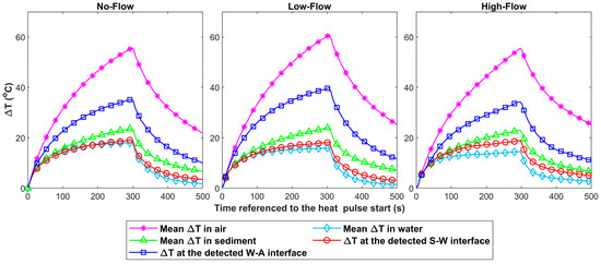 Examples of the observed during and after the application of the heat pulse at the detected S-W and W-A interfaces and the mean observed in the device sections surrounded by sediment, water, and air. The markers used to distinguish the different signals were added every five measurements for clarity purposes.