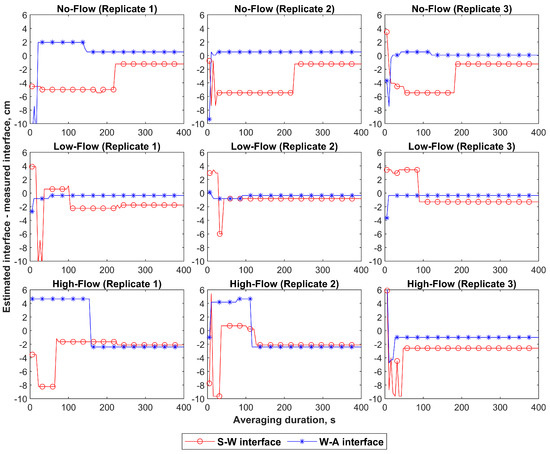 On the other hand, shorter averaging durations of 9964 s, 5141 s, and 10167 s were required to obtain stable measurements of the W-A interface in the no-flow, low-flow, and high-flow conditions, respectively. The maximum average duration required to detect the W-A interface in all the tested conditions was 159 s. Therefore, a period of 238 s was sufficient to accurately estimate the location of the S-W and W-A interfaces in all tested conditions.