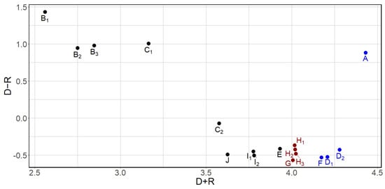 - Produce a final cause-and-effect diagram. To identify the causal connections and interactive influences between the various elements, results derived from the procedure are eventually depicted in a diagram showing cause-and-effect relationships. The sum of each row and each column of T has to be computed. The sum of rows (D) and columns (R) can be calculated as follows:The values of and show, respectively, the system’s overall importance of element i and its net impacts as a result of component i. By aligning the values of on the horizontal axis and on the vertical axis, the cause-and-effect diagram is created. The coordinate system determines the position of each factor and how it interacts with a point in the space .