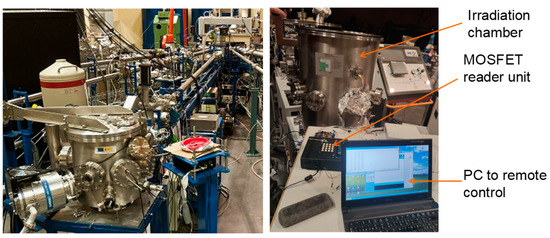 Two MOSFET samples were introduced into the irradiation chamber at the same time but irradiated one by one. Each sample was externally connected with an independent cable with the outside of the ionization chamber via a cable gland. The reader unit was placed outside but close to the ionization chamber. Therefore to change the sample being tested, just the connected cable should be switched. A total of four sets of three samples were characterized, with different bias voltages during irradiation. Each set of samples was biased to 0 V, 1 V, 5 V, and 10 V, respectively.