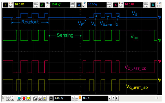 - Sensing mode: In this state, the gate and the drain of the MOSFET are disconnected (the JFET_GD is cut-off, applying a negative voltage in its gate, −13 V in our case) and the source and drain of the pMOS transistor are connected via JFET_SD. To increase the sensitivity, an external bias voltage is applied by the reader unit to the pMOS gate up to 25 V (0, 1, 5, and 10 V in this study).