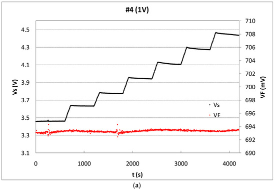 The readout of VF or VS and sensing modes are selected during each irradiation and rest periods and the results are sent to the computer every 4.6 seconds, as Figure 4 shows. To avoid the body effect, the bulk terminal is connected with the source terminal in all states. To minimize the temperature effect, the reader was configured to measure, biasing the pMOS in the readout mode at IZTC, the minimum temperature coefficient drain current (230 µA in our case [26]), at this current the temperature coefficient of the source voltage is minimum. In addition, the silicon temperature was monitored during measurements, using the parasitic diode (see Figure 3 and Figure 5a). The VF during the experiment showed a stable value, as Figure 5a shows, for the sample #4. The forward voltage of this sample was, in average, VF = (693.38 ± 0.18) mV, that implies a temperature variation of approximately 0.1 ºC. The performance of the other samples was similar. Therefore, the temperature drift was not relevant during the irradiations in this study. Therefore, after each irradiation, in the readout mode, the complete measurement process consisted of three voltage and one current measurement. The first one was the forward voltage of the parasitic diode (VF), after the source voltage and the amplified source voltage (VS and VS,amp, respectively), and finally the drain current (ID), as the oscilloscope screenshot shows in Figure 4, in which two complete irradiation-readout cycles are represented. The red and yellow lines show the gate-source voltages of the JFET_GD, VG_JFET_GD, and JFET_SD, VG_JFET_SD, respectively. The blue and green lines depict the gate-drain and source voltages, VGD and VS, respectively.