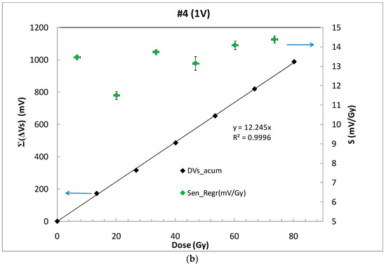 Alternatively, with empty symbols in Figure 5b, the sensitivity by shot has been calculated including the short-term fading effects, with the source voltage value not just after the irradiation but after the 8 min rest period between shots. Hereinafter, we will refer to this sensitivity as S. With these data, the average sensitivity was calculated as the slope of the accumulated source voltage shifts versus the accumulated dose. From Figure 5b, a high linear sensor response can be observed in terms of sensitivity.