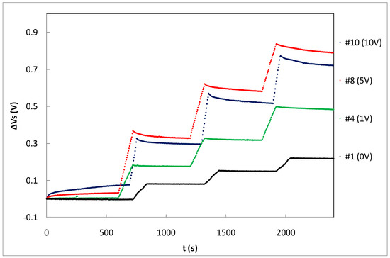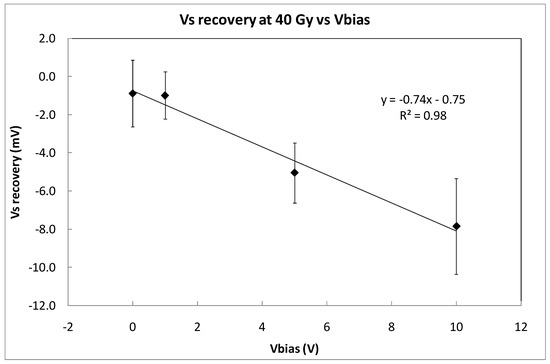 Table 1 summarizes the average sensitivity achieved with different bias voltages for individual samples and the average per set. Due to dispersion of the samples’ sensitivity, an individual calibration is required to be used as dosimeter. As was expected, the highest sensitivity was reached at the highest bias voltage due to the higher electric field inside the gate oxide that reduces the recombination ratio of the electron-hole pairs created by the ionizing radiation [14]. A linear dependence was found, showing a slope of (mV/Gy)/V between the average sensitivity and the bias (gate) voltage as shown in Figure 6. According to this, it would seem that the most suitable voltage would be the highest studied value (10 V in our case). However, some factors should be considered as well. If the magnitude of interest is the dose-rate, determining the slope of the source voltage during irradiation (instant sensitivity) and high bias voltage would be more accurate. However, to calculate the accumulated dose, measuring before and after irradiations, the fading effect should be taken into account. In Figure 7, the source voltage shifts of four different samples biased at 0, 1, 5, and 10 V are displayed.