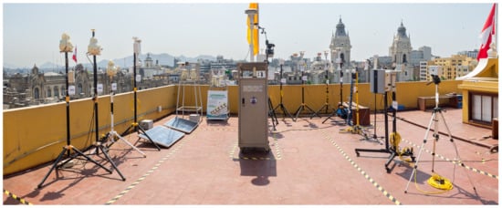 A field data collection campaign was conducted with the above instruments between the months of November 2021 to January 2022 in the city of Lima (Peru). The place of the campaign was the roof of the Municipal Palace of Lima, located at the Lima main square at latitude −12.045287317106624, longitude −77.03090612125114 (UTM Easting 278922, UTM Northing 8667635) and altitude of 160 m above sea level. The height of the building was about 8 m. Figure 1 shows the arrangement of the evaluated devices, located at a maximum distance of 2 m from the reference station. The meteorological conditions of the site in the period of data collection correspond to the end of the spring season and the beginning of summer, with temperatures ranging from 18 to 26 C and relative humidity between 70% and 90%. The hourly averages of the wind speed vary between 0.5 and 2.1 m/s, with the lowest values appearing between 5 and 9 h and the highest values between 17 and 21 h. The prevailing wind direction is from the south, followed by the southeast. Figure 2a–d shows plots of hourly averages of temperature, humidity, solar radiation, and wind speed, respectively, throughout the day for each month involved in the data collection campaign.