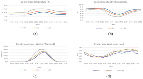 Plots of hourly mean temperature (a), relative humidity (b), solar radiation (c) and wind speed (d) for the three months involved in the study (November 2021 to January 2022). The hourly mean temperature and solar radiation increase with the arrival of summer (December–March), while the humidity decreases.