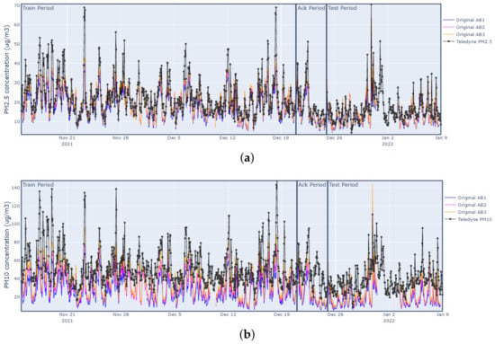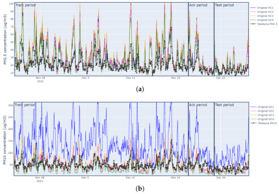 Plots of and hourly data collected by the AirBeam sensors and the reference sensor (Teledyne) during 15 November 2021 to 8 January 2021: (a) hourly series measured by the AirBeam sensors; (b) hourly series measured by the AirBeam sensors.