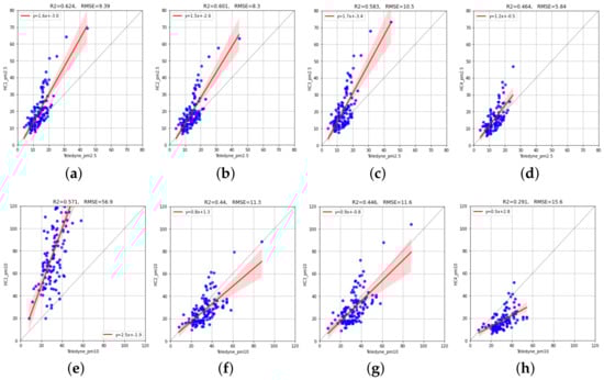 Scatterplots of the reference (Teledyne) vs. IQAir hourly measurements in the Test period. The top row shows results for the sensors. The bottom row shows results for the sensors. The red line represents the linear regression function between candidate sensor values and reference sensor values adjusted with data from the Train period: (a) HC1 (); (b) HC2 (); (c) HC3 (); (d) HC4 (); (e) HC1 (); (f) HC2 (); (g) HC3 (); (h) HC4 ().