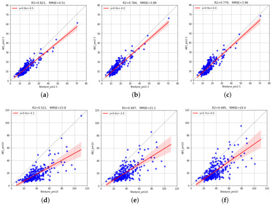 Scatterplots of the reference (Teledyne) vs. AirBeam sensor measurements in the Test period. The top row shows results for sensors. The bottom row shows results for sensors. The red line represents the linear regression function between candidate sensor values and reference sensor values adjusted with data from the Train period: (a) AB1 (); (b) AB2 (); (c) AB3 (); (d) AB1 (); (e) AB2 (); (f) AB3 ().