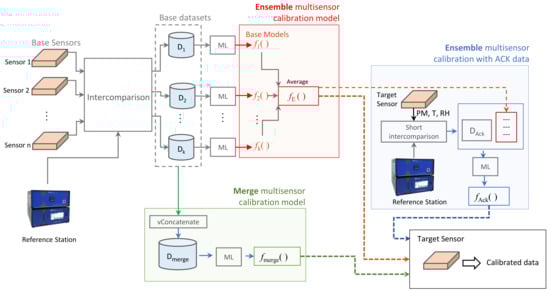 - Merge Multisensor Calibration Model: This model is obtained by first merging the base datasets (vertical concatenation): and then fitting a single model on this merged dataset using the same ML methods as those indicated in Section 2.4.1. The idea behind fitting a model with data from several base sensors is that it can generalize the calibration task to new sensors.