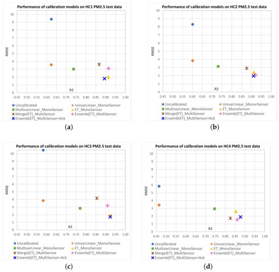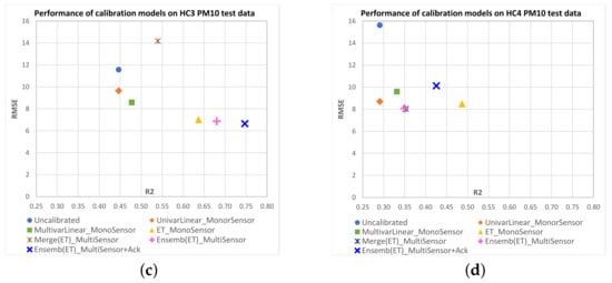 Scatterplots of vs. mean values obtained on test data for each IQAir sensor as candidate sensor with the different calibration models. The ideal performance is the point with and , which is the lower right corner of the plots. Points closest to that corner represent models with better performance. Subfigures correspond to the following candidate sensors: (a) HC1; (b) HC2; (c) HC3; (d) HC4.