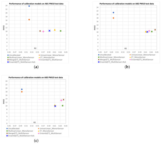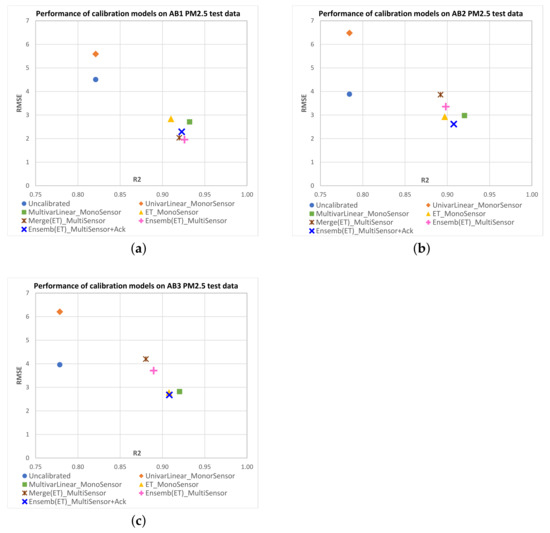 Scatterplots of vs. mean values obtained on test data for each AIRBEAM sensor as candidate sensor with the different calibration models. The ideal performance is the point with and , which is the lower right corner of the plots. Points closest to that corner represent models with better performance. Subfigures correspond to the following candidate sensors: (a) AB1; (b) AB2; (c) AB3.