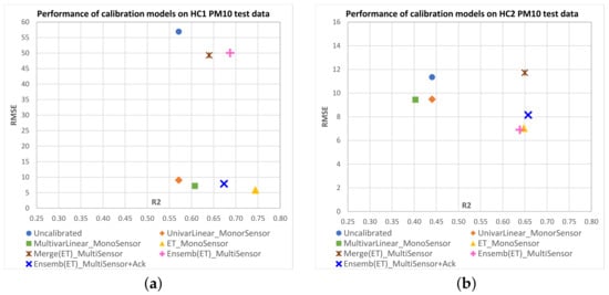 Figure 8 shows scatterplots of vs. mean values obtained on the test data for each IQAir target sensor with the different multisensor approaches. Figure 9 shows equivalent results for AirBeam sensors, and Figure 10 and Figure 11 show results for sensors. Additionally, we have included in the plots the mean performance points of original measurements (uncalibrated) and the monosensor models: univariate linear regression (UnivarLinear_MonoSensor), multivariate linear regression (MultivarLinear_MonoSensor) and extra trees regression (ET_MonoSensor), which was the best monosensor model. The ideal performance is when and , which corresponds to the lower right corner of the plots. Thus, points closest to that corner represent models with better performance.