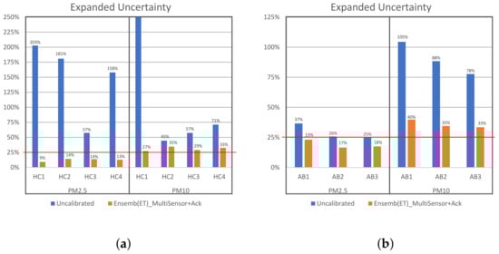 Expanded uncertainty of the original test measurements and of the data corrected by our best calibration models (Ensemb(ET)_MultiSensor+Ack) of the different IQAir and AirBeam sensors. The red line indicates the quality objective of 25% of expanded uncertainty to be considered as equivalent measurement for the monitoring of PM, according to Directive 2008/50/EC of the European Commission; 50% of expanded uncertainty is the quality objective for indicative measurements; (a) IQAir; (b) AIRBeam.