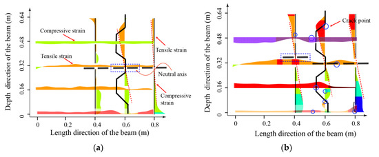 It can be observed that, in the elastic stage (Figure 12a), the longitudinal strain distribution close to the shear key conforms to the deformation in the bending of a beam. The upper part of the section is in compression, and the lower part is in tension, with the neutral axis close to the middle of the cross-section. The strain on the shear key section roughly presents a linear distribution. The vertical strain along the cross-section depth in the shear key section shows tensile strain at the upper part of the beam and compressive strain at the lower part. As the load increases (Figure 12b), strain concentration areas appear around the shear key. These areas mainly concentrate near the key tooth. Among them, obvious strain peaks appear at the edge of the negative key tooth and at the corner of the positive key tooth. The neutral axis of the left segment tends to rise, while the neutral axis position of the middle segment shows no obvious change. With further increases in load (Figure 12c), the area with large gradient strain begins to develop macroscopic cracks. The cracks in the tension zone of the shear key expand, resulting in additional cracks. At the same time, it is worth noting that, at this point, the neutral axis position of the middle segment only slightly rises due to the expansion of the cracks on the tension side, while the neutral axis of the left segment rises significantly. The height of the tension zone in the figure reaches three times the height of the compression zone. This indicates that, with the cracking of the shear key, there has been a significant change in the load transfer path between segments. The zone at the middle of the segment remains relatively stable, while the sections passing through the shear key have large parts under tension. This is due to the lack of contact between the interfaces and the high reduction in the interaction force between segments provided by the cracked shear key, resulting, at the end, in the compressive failure at the top of the beam (as shown in Figure 12d).