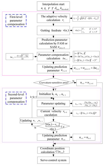 are input into the two-level parameter compensation module. Then, the first-level parameter compensation is performed. In this process, the adaptive velocity of the next interpolation point is calculated using the adaptive velocity approach described in Equation (5) and is restrained under the command feedrate constraint according to Equation (6). The estimated parameters