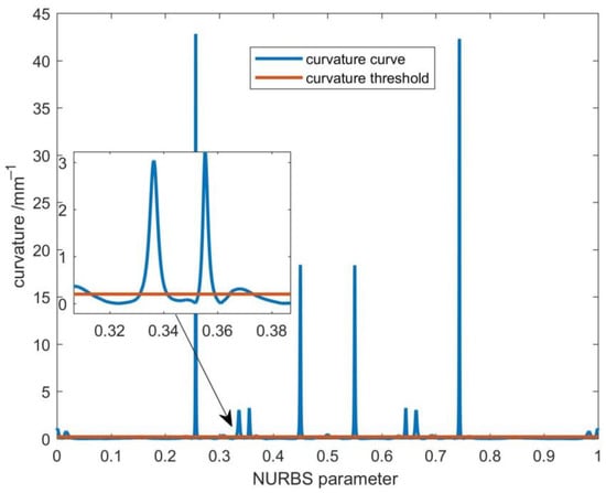 Then, the curve is divided into numerous sections based on the curvature threshold. The NURBS curve’s high and low-curvature areas are defined as the portion with curvature larger and less than the threshold, respectively. It can be seen from the curvature characteristics that when the interpolation point is located in the low curvature area, the feedrate fluctuation is slight, and only the first-level parameter compensation is required. In contrast, when the interpolation point is located in the high curvature area, the feedrate fluctuation is significant, and it is necessary to perform the second-level parameter compensation after the first-level parameter compensation.