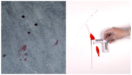 (Left) Blood stains on a floor, photographed without a size reference, making its dimensions impossible to judge. (Right) Blood stain on a white wall, with a physical size reference held close to it by an assistant, which introduces a risk of touching and altering or transferring the trace material.