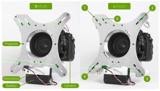 The FreeRef-1 projector mounted on a Nikon D610 camera with an 18–135 mm objective; however, this is not the objective used in the verification tests, which is shown in Figure 4. (Left) Lasers in S-mode, closest to the objective. (Right) Lasers in L-mode, furthest from the objective. Lasers 1 to 4 are the size reference lasers. Laser 5 is the mode laser that is used to detect the selected mode in the photos.