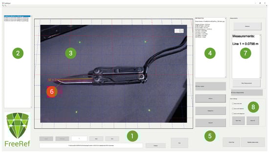 The FreeRef-1 (version 20230130) software interface. (1) Folder and file selection, and analysis run button. (2) List with photos found and analyzed in selected folder. (3) Viewing and working area showing the photo selected in area 2. The locations of the detected laser dots are marked with stars and a size reference grid is placed as an overlay, oriented with the same rotation as the calculated projection plane rotations. (4) Summary of photo info and detection results. (5) Buttons for hiding/displaying grid around or on the photo, and laser detection points on or off. (6) Measurement performed by the user in the shown photo. (7) Overview of measurement numbers and real-world lengths on the projection plane. (8) Picture-saving options selection buttons for exporting annotated files with grid or measurements added.