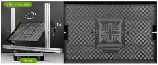 Calibration plate used for the verification tests. (Left) The calibration plate in its holder, with the horizontal rotation axis Txx and vertical rotation axis Tyy indicated. (Right) Frontal view of the calibration plate.