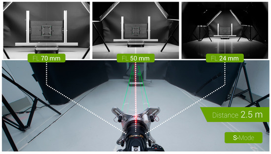 Test setup used for the verification tests, with three example verification pictures at the 2.5 m working distance in the S-mode, showing the effect of using different focal lengths.