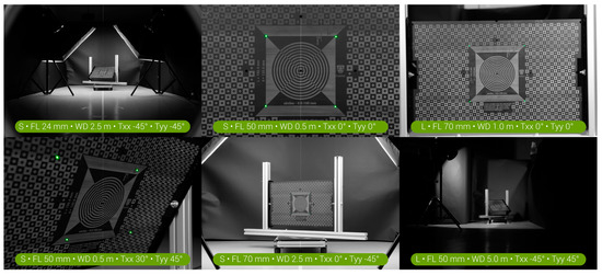 Six arbitrary examples of the photos with the calibration plate used in the verification tests for the tested use conditions. S = S-mode, L = L-mode, FL = focal length, WD = working distance.
