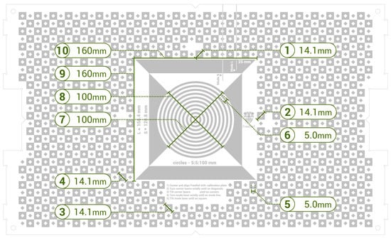 The calibration plate (Figure 5) had laser-engraved markings that indicated where the laser dots should be when the projector was in the S- and where in the L-mode, which guided the calibration of the projector’s reference lasers’ orientations. In addition, circles and squares with known dimensions were engraved on the calibration plate to enable the assessment of the FreeRef-1 software measurement accuracy by measuring these known distances in the FreeRef-1 software.