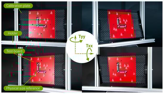 Photos of the test board were shot using the same setup as for those taken for the technical verification and sensitivity tests (see Section 2.2.2), except here, the laser-engraved test board was mounted to the center of the calibration plate (Figure 9). Photos were shot in S-mode at a working distance of 1 m, using a focal length of 50 mm. Rotation Txx around the horizontal axis varied from −30° to +30° in steps of 15°. At each Txx, rotation Tyy around the vertical axis varied from −30° to +30° in steps of 15°.