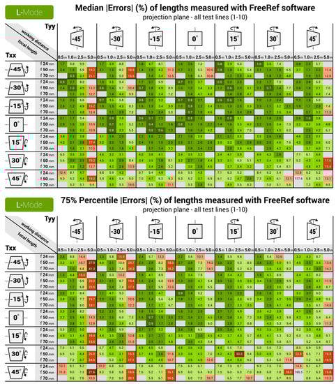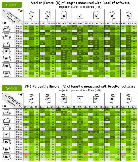 Statistical analysis was conducted in RStudio (RStudio, PBC, v2021.09.0 Build 351). To investigate what factors most affect the FreeRef-1 system’s performance, the measurement data were checked for effects of the independent variables (working distance, focal length, and the two projection plane angles Txx and Tyy) on the dependent variable (absolute percentage measurement error). There were too many degrees of freedom to allow using an n-way MANOVA for analyzing the effects of all the combined factors, while taking the ten verification line measurement errors as separate dependent variables. Therefore, for each photograph, the verification line measurement errors were taken as a single dependent variable. This was achieved for the S-mode and L-mode photographs separately.