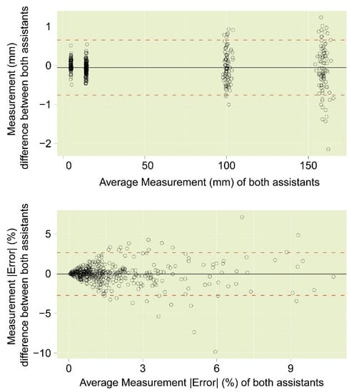Inter-assistant differences were checked using a two-tailed paired t-test to check for statistically significant differences (p < 0.05) between the two assistants’ measurements. Inter-assistant agreement was checked by creating Bland–Altman plots, comparing all the inter-assistant measurements to the same measurements taken by the other assistant in the main process, both for the measurement values in mm, as well as for the percentage absolute measurement error.