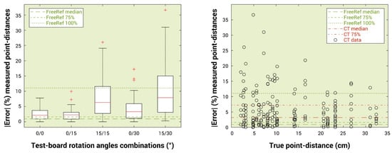 Error calculations were performed for all point distances determined by the participants during the tests. These differences with the actual point distances were computed by subtracting the true distances from the participant-determined point distances. The absolute (magnitude) values of these errors were expressed as a percentage of the corresponding true point distances, along with the median and 75% interval of the FreeRef-1 technical verification data for the subset, using Tyy and Txx angles between −30° and 30° for reference.