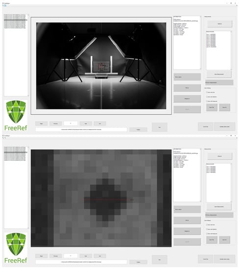 The FreeRef-1 software was developed in Matlab (version R2019b, Matwhorks Natick, MA, USA). The user can load a folder with JPG photo files taken with the projector switched on, which is then automatically processed by the software to detect the laser dots (Figure 3). If the software cannot find an appropriate set of dots, it will prompt the user to indicate them. If any laser dots are detected incorrectly, the user can override the results. The software combines EXIF information about the camera sensor, camera objective focal length and about the FreeRef-1 projector with the locations of the detected laser dots. This is used to first calculate the horizontal and vertical rotations of the plane on which the laser dots are visible in the photo (the projection plane), with respect to the photo camera sensor. With these rotations known, a transfer function from pixel-space dimensions in the 2D photograph to real-world 3D locations in meters on the projection plane is determined. This way, measurements can be taken anywhere on the virtual plane through the projected laser dots, while taking perspective effects into account.