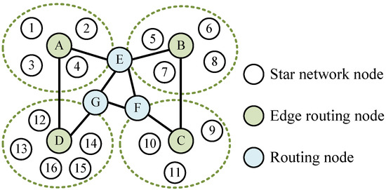 A typical IWNSs topology diagram is shown in Figure 1. Note that the nodes in the mesh level are divided into general routing nodes responsible for network interconnection (i.e., nodes E, F, and G) and edge routing nodes intended to access the star network (i.e., nodes A, B, C, and D). Frequent iterations are the key point that causes the slower convergence speed of distributed time synchronization algorithms. Consequently, the core idea of our design is to make fewer nodes bear the distributed iterations, in contrast, more nodes obtain synchronization by overhearing. For two-layered IWSNs with a mesh–star hybrid architecture, a few routing nodes with strong communication capability can be used to cover the industrial network with large-scale low-power sensing nodes. Furthermore, it employs the routing nodes participating in the synchronization iteration process to reduce the number of packet exchanges effectively.