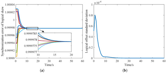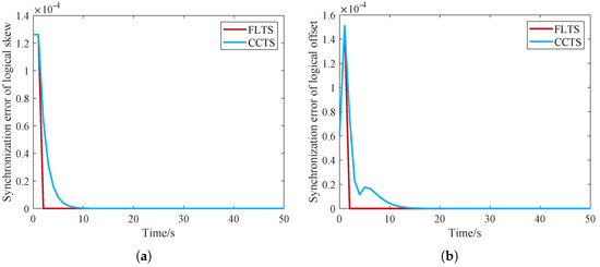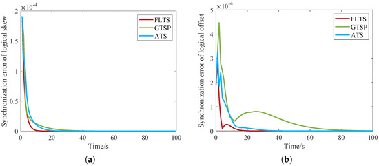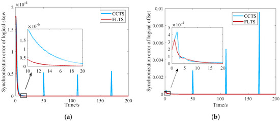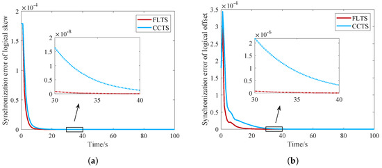 Figure 3. Convergence comparison of the logical clock in whole network. (a) Logical clock skew; (b) Logical clock offset.