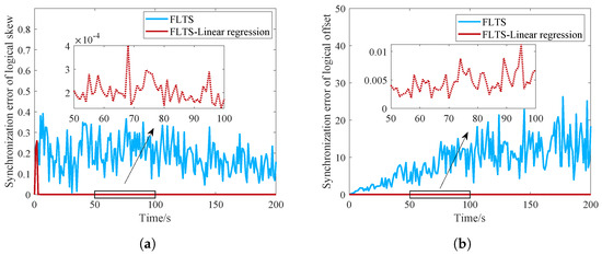 In the follows, we discuss the performance of FLTS under the impact of random communication delay. In FLTS, the mesh layer adjusts the relative clock skew by average iteration, which is essentially a low-pass filter. It can suppress part of the impact of delay on the calculation of the relative clock skew. However, if there is no measures taken during the synchronization at the mesh level, the synchronization divergence is inevitalbe. In the simulation, set the communication delay with mean 2.5 × 10 4 and variance 1 × 10 8 . As shown in Figure 8, the linear regression method can effectively reduce the synchronization error of the logical clock skew and offset. Nevertheless, the network cannot achieve absolute synchronization under communication delay, the synchronization error of logical clock skew still affect the logical offset synchronization. The maximum synchronization error of the whole network gradually increases with time, however, the effectiveness of linear regression is still reflected.