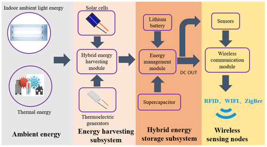 When subjected to indoor ambient energy excitation (e.g., indoor artificial light sources, natural light filtered through windows, waste heat from factory machines), both PV cells and TEGs generate direct current (DC) power, albeit with different electrical characteristics. A single PV cell or TEG cannot satisfy the power demand of a wireless sensor node, thereby necessitating the use of hybrid strategies based on two or more mechanisms [30]. The energy-harvesting subsystem ensured optimal power generation performance of the harvesting device, while the hybrid energy storage subsystem stored the intermittent power generated by the energy-harvesting subsystem in a lithium battery, which powered the IoT sensor nodes. The introduction of solar and thermal energy eliminates the need for frequent battery replacements, minimizes environment pollution, prolongs the system’s lifetime, and lowers system maintenance costs.