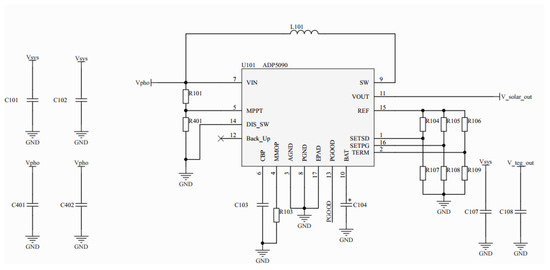 The solar energy-harvesting circuit, as illustrated in Figure 2, was centered around the ADP5090 ultra-low power chip, which integrates a nanometer power boost regulator and an energy storage element management controller. The circuit was designed to convert DC power from PV sources and was capable of charging both a rechargeable battery and an SC. To achieve this, each of the system’s five light-receiving surfaces was covered with a 40 mm × 40 mm × 1.1 mm amorphous silicon solar cell, which were then connected in parallel to the input interface of the solar energy-harvesting circuit. Amorphous silicon solar cells were chosen as light harvesters because they have a higher conversion efficiency than crystalline silicon solar cells in low-light indoor conditions [31]. Although there was a significant difference in light irradiance across the five surfaces of the system, especially in indoor artificial light, the output voltage of each amorphous silicon solar cell was only slightly affected by light irradiance. Therefore, each PV side could be connected in parallel without significant impact on their output power. Consequently, the solar energy could be efficiently harvested by the system, and the circuit was capable of outputting a steady 4.2 V.