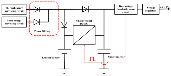 - Alternatively, each energy harvester can be connected to a separate DC/DC converter, which is then connected in series with a diode and finally outputted in parallel (also known as power OR-ing) [36]. While this method may result in some energy loss, each energy harvester can be highly efficient at harvesting ambient energy. This strategy is particularly suitable for hybrid energy harvesting of thermal and solar energy, as in our system. Notably, both the ADP5090 and MCRY12-125Q-46WI chips have a diode built into the output, obviating the need for extra diodes.