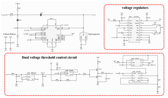 This paper presents the design of an energy management module based on a hybrid diode semi-active topology that used a 6.8 mF SC with low equivalent series resistance (ESR) and low leakage current as the power buffer. The circuit implementation is illustrated in Figure 5. The unidirectional DC/DC converter used in the design was the LTC3335, which has a quiescent current of 680 nA. This buck-boost converter has a programmable peak input current range of 5 to 250 mA, and its peak input current limit in this system was set to 10 mA to prevent high-current discharge of the battery. The dual voltage threshold control circuit was composed of low-power chips, including the LDO chip TPS7A0218, the comparator chip TLV3691, the electronic switch chip ADG819, the chip LTC1540, and non-gates (i.e., composed of PMOS and NMOS). The design also incorporated the LTC3129-1, a buck-boost converter with low quiescent current and high efficiency, which was set to output a voltage of 3.3 V. The quiescent power of the management circuit was calculated to be less than 10 µW based on the data sheet for each chip’s quiescent current and operating voltage, thus meeting the system’s demand for low power consumption.
