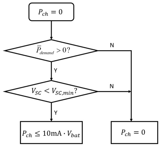 The flow chart of the modified SC first EMS is shown in Figure 6, where is the voltage of the battery, is the output power of the battery (if is positive, the SC is charged by the battery; otherwise, the battery is discharged by the SC), is the system power demand, is the voltage of the SC, and is the minimum discharge voltage of the SC. The voltage range of the SC was set to be 2.5–4.2 V. When the harvested power was insufficient ( > 0), the battery charged the SC with no more than 10 mA current until the SC was fully charged. At this time, the discharge power of the battery was larger than the average load power, and the SC would be fully charged in a short time to respond to the variable power demand of the load. Conversely, when the harvested power was more than needed ( < 0), was set to 0, and the battery or SC was charged by the energy-harvesting unit according to their respective voltages.