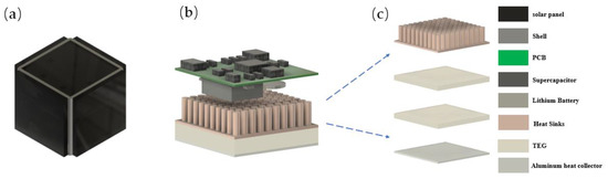 Figure 7a shows the 3D model of the self-powered sensor node, which had a cube shape with dimensions of 44 mm × 44 mm × 40 mm, resulting in a volume of 77.44 cm³. The system had five light-receiving surfaces, each covered with a 40 mm × 40 mm × 1.1 mm solar cell. The TEG device was located at the bottom of the system, and its internal structure is illustrated in Figure 7c. As shown in Figure 7b, the energy storage devices were mounted on the back of the PCB. The shell was manufactured using 3D printing technology, which minimized the system’s size while minimizing space redundancy and increasing the system’s energy and power density.
