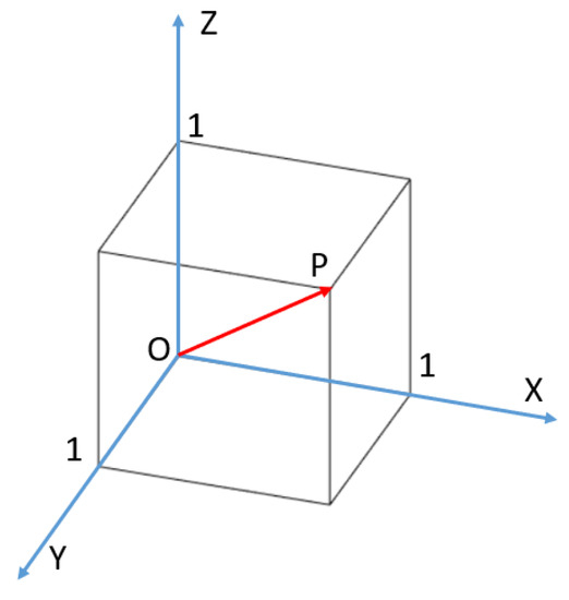 The system could be approximately considered as a cube with three equal sides. The XYZ coordinate system was defined with the origin O = (0, 0, 0), as seen in Figure 8. According to Euler’s rotation theorem, any 3D rotation can be specified using two parameters: a unit vector that defines an axis of rotation and an angle θ describing the magnitude of the rotation about that axis [37]. The unit vector of the rotation axis is = (1,1,1). The objective is to rotate the to coincide with the Z-axis; at this time, the system has the biggest projection to the ground. Assuming is rotated degrees around the X-axis and then degrees around the Y-axis to coincide with the Z-axis, ’s coordinates at this point are (0, 0, ) due to the fact that its length has not changed during the rotation.