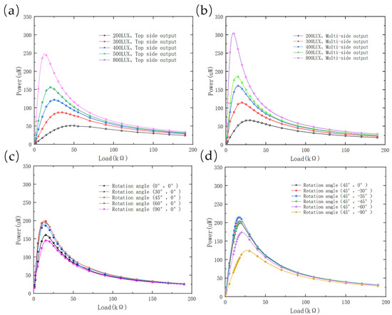 (a) P-R curves for single-sided PV; (b) P-R curves for multi-sided PVs; (c) P-R curves for single-sided PV with different rotation angles (fixed light intensity 400 lux, rotation around X-axis); (d) P-R curves for multi-sided PVs with different rotation angles (fixed light intensity 400 lux, rotation around Y-axis). The point data in the graphs were measured and the curves were fitted after three interpolations of the point data.