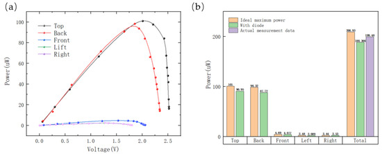 Furthermore, when the multi-sided PVs were rotated by 45° around the X-axis, the output power and voltage of each surface PV in the system were analyzed, as illustrated in Figure 10a. It was observed that the open-circuit voltage of each surface PV did not show any significant difference. In a traditional multi-sided scheme, a series diode is added to each surface PV to prevent mutual interference between the PVs. The standard Schottky diode voltage differential ranges from 0.1 to 0.3 V. Taking into account that the harvested energy was confined to the micro-watt range, a diode voltage differential of 0.2 V was selected to calculate the maximum harvested energy by each side of the traditional multi-sided scheme, with each PV connected in series with a diode, as well as their sum. In contrast, the proposed scheme of connecting each PV directly in parallel was examined to determine the potential for enhanced energy output. The results are illustrated in Figure 10b, revealing that the total maximum output power was higher by approximately 10.92% in the proposed scheme as compared to the traditional multi-sided scheme. In experimental evaluations, the proposed method exhibited exceptional performance with the maximum harvested energy being close to the ideal maximum energy. These findings validated the high effectiveness of the proposed approach.