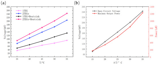 (a) Changes in open-circuit voltage with temperature gradient for different configurations of the TEG device; (b) performance of the TEG device comprising two vertically stacked TEGs and a heatsink.
