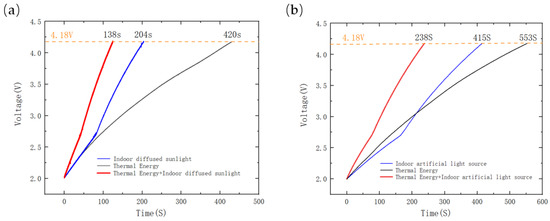 Indoor natural light testing was conducted at 4:00 p.m. with an indoor temperature of 19.1 °C, and the heating platform was set to 40 °C. The illuminance on the top surface of the system was measured to be 355 lux, and the power generated from indoor scattered natural light, thermal energy, and their combination was measured. The thermal energy was harvested by setting the heating platform to 40 °C and allowing the system to reach thermal equilibrium. The results, depicted in Figure 14a, demonstrated that the average charging power for thermal energy was approximately 106.53 µW, while for indoor scattered natural light, it was 272.66 µW. Interestingly, when thermal energy and indoor scattered natural light were combined, the average charging power increased to 369.44 µW. Compared to solar energy alone, the combination increased power harvest by 35.49%, and compared to thermal energy alone, power harvest was remarkably increased by 246.79%.