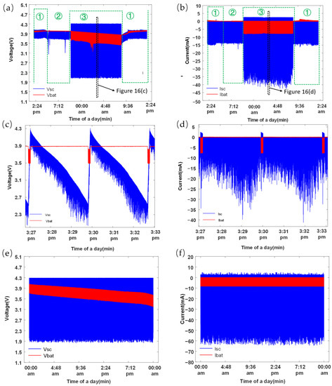 Daily performance of self-powered IoT sensor nodes. (a) The voltages of battery and SC; (b) The currents of battery and SC; (c) Local enlargement of (a); (d) Partial enlargement of (b); (e) The voltages of battery and SC under extreme conditions; (f) The currents of battery and SC under extreme conditions. The serial numbers in the sub-figure (a,b) indicate different time periods, with 1 representing 7:30 a.m. to 5:00 p.m., 2 representing 5:00 p.m. to 9:00 p.m., and 3 representing 9:00 p.m. to 7:30 a.m., covering a total of 24 h.